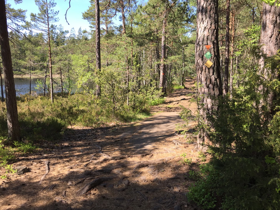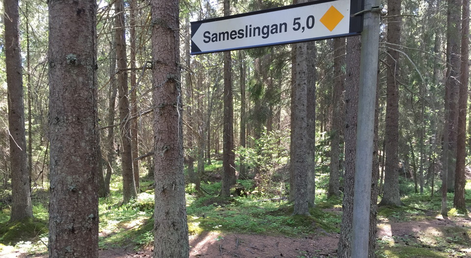The Sami trail is marked with yellow diamonds and runs through old coniferous forest up on the rocky ground and past two lakes. There are several barbecue areas along the trail.