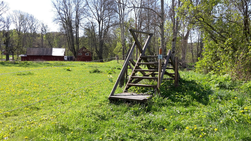 The path is marked in orange and runs on paths through wetlands and pastures. The path also goes past the bird tower at Lissmasjön.