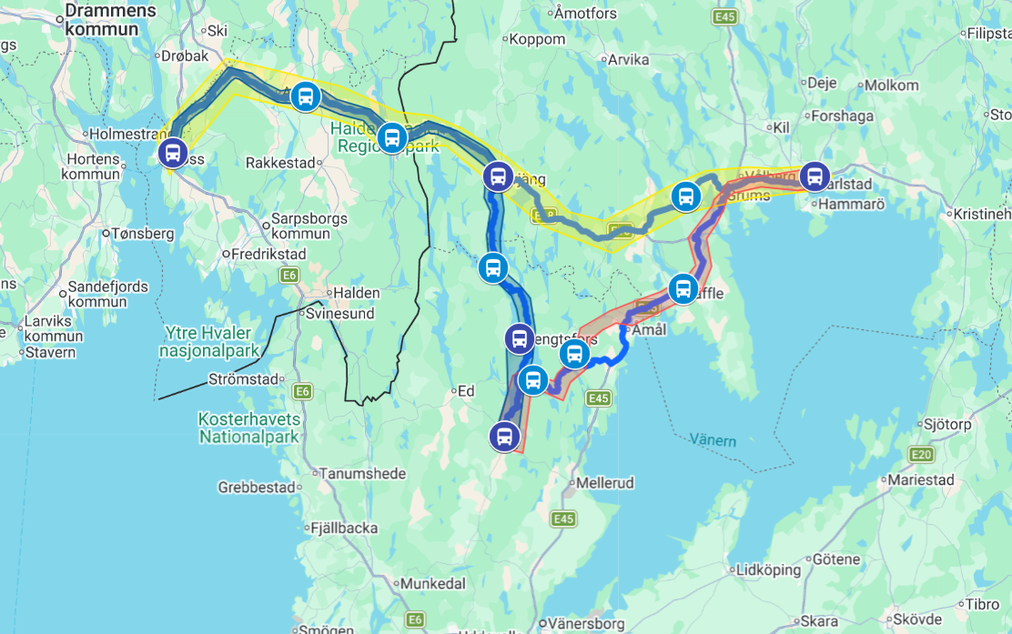 Tuesdays: Bäckefors (Bengtsfors) – Karlstad – Moss – Bäckefors (Bengtsfors) (counterclockwise)