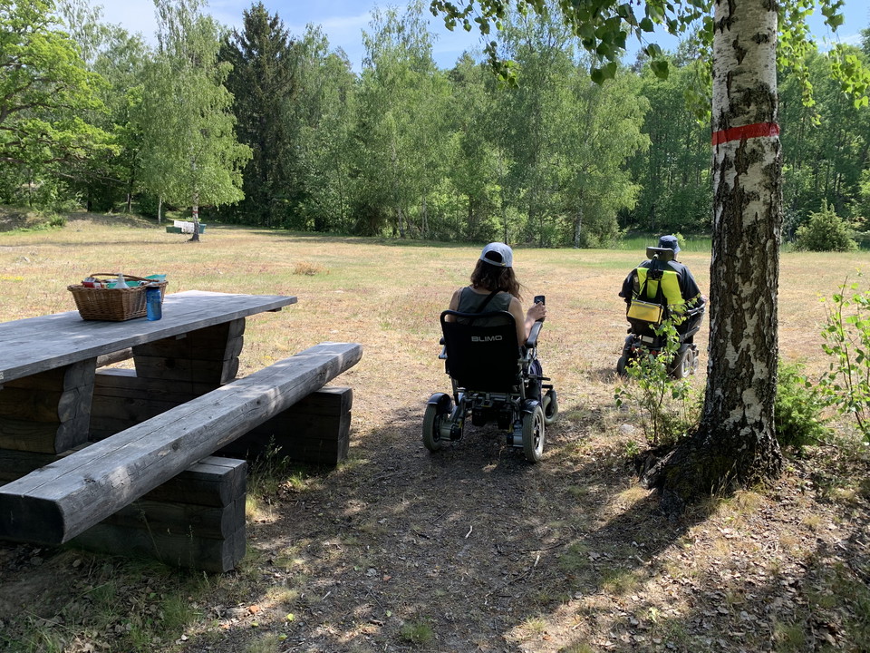 Det finns två rastbord på ängen, välj bordet till höger, dit är det rullvänligt underlag.