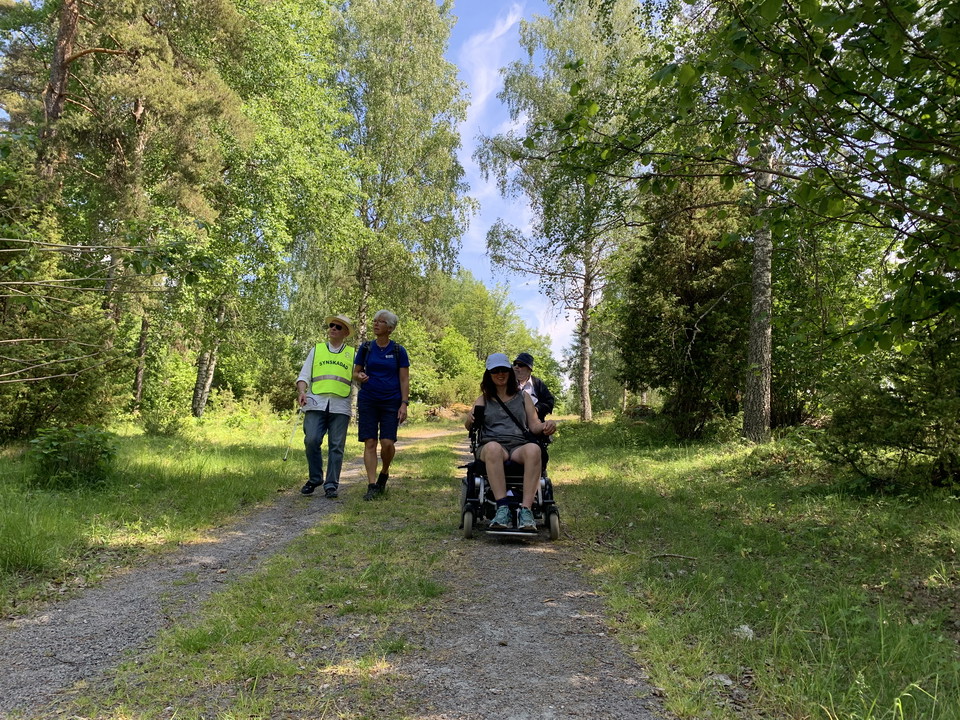 Två elrullstolar och med en person med synnedsättning.