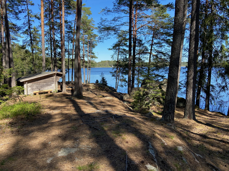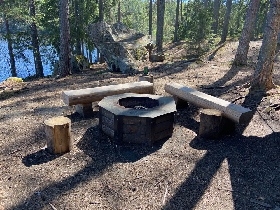 Shelter, fireplace and benches at the southern end of Lake Tena.