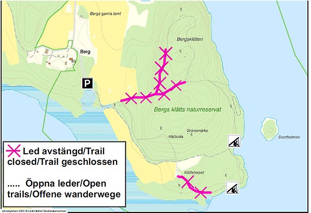 The western trail to the top of the cliff and the trail between Klättetorpet and the southern windbreak are temporarily closed due to large amounts of dry trees that risk falling.