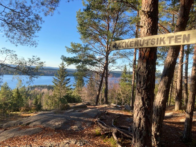 The view of Lake Racken to the west is stunning. Here is a small sitting bench but no table.