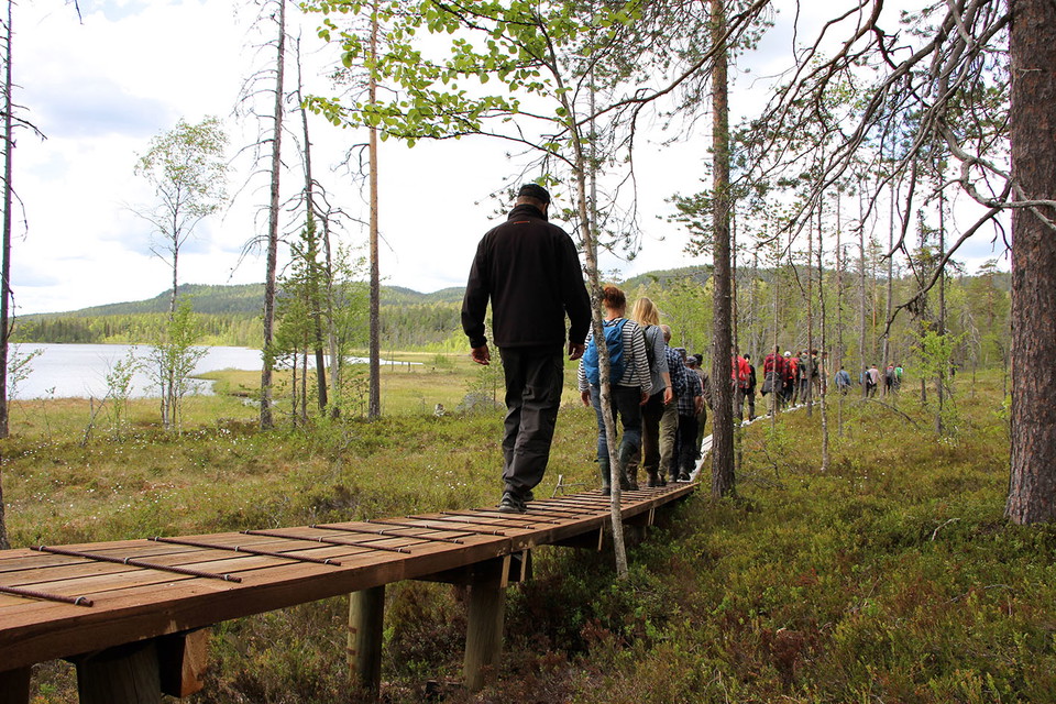 After the entrance area with ramp, information, rest area, cold spring and gold star, the red trail continues over marshes and really nice old forest. After a little over a kilometer you reach Angsjökojan.
