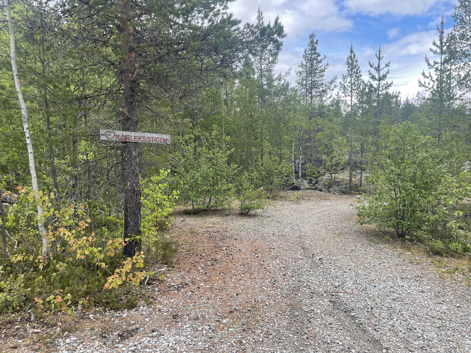 Kärleksstigen starts / ends at the E45 road where Terminalvägen goes towards Stensele. Here you pass under the railway viaduct and over the railway where the snowmobile trail also runs in winter.