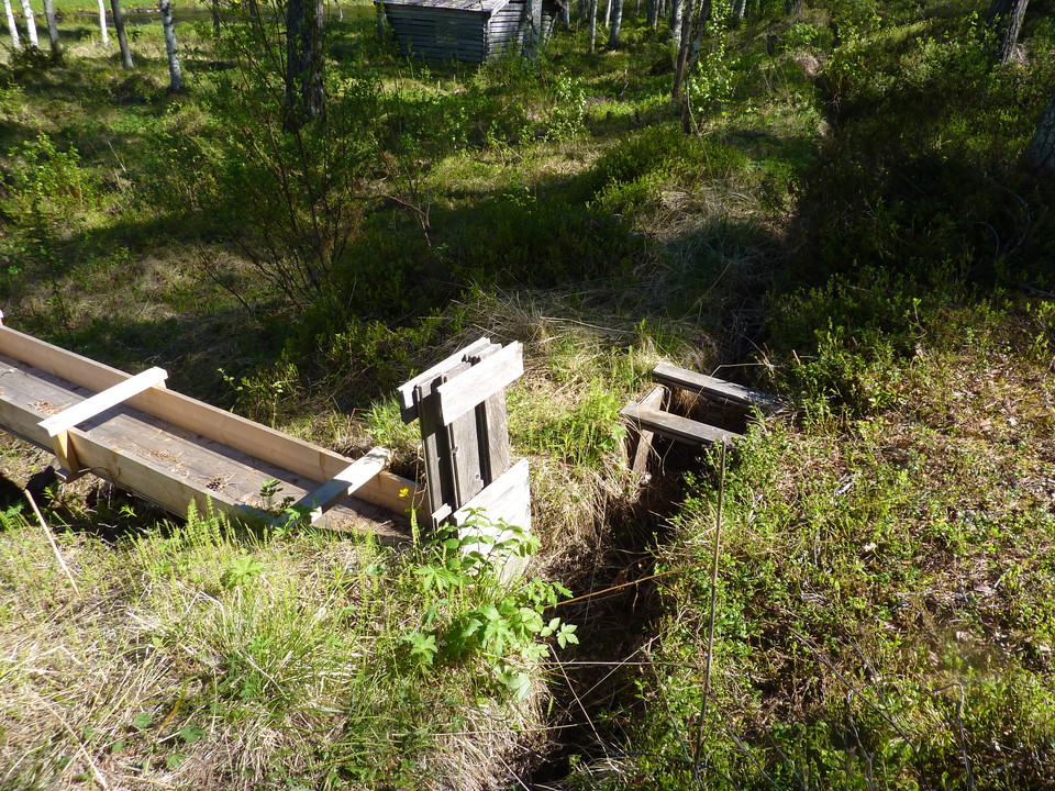 In Rörträsk, the volume of cattle fodder harvested was increased by artificially irrigating the natural meadows along the Petikån river. The water was led in a long ditch from an adjacent stream to the hay meadows. The supply of water from the stream was regulated by small floodgates that were opened after the spring flood and closed a few weeks before haymaking.