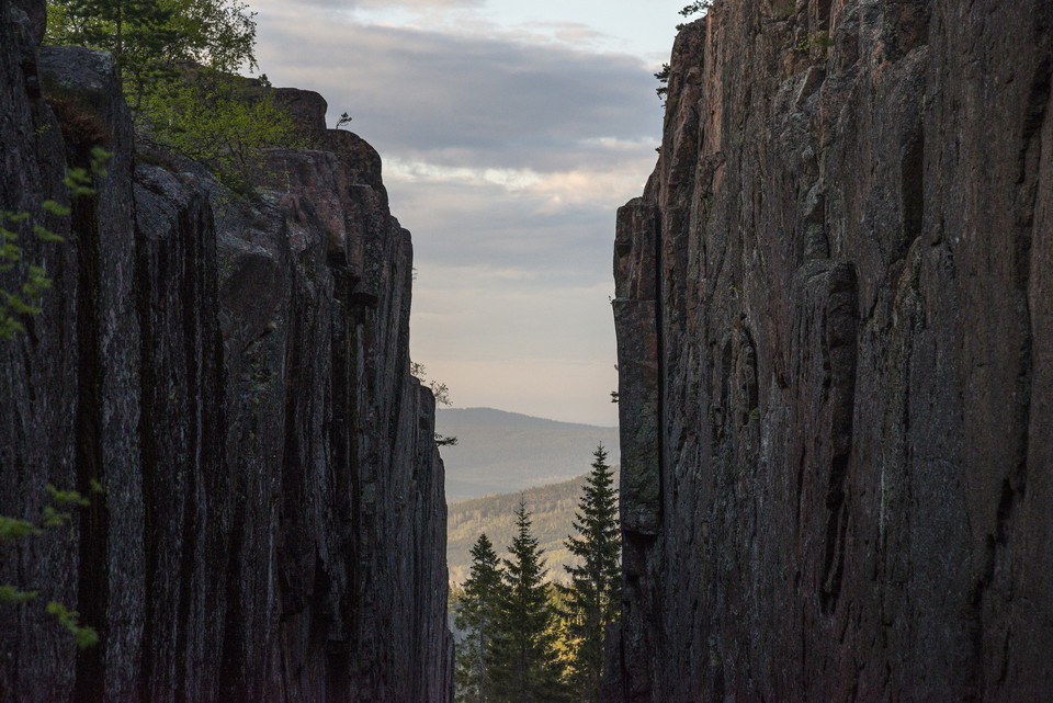 One of Skuleskogen's major attractions is Slåttdalsskrevan, which is located in the middle of the stage. The crevice is about 210 meters long, 7 meters wide and 40 meters deep with vertical walls.