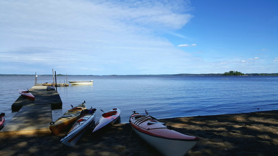 A sandy beach and grass on the shore of Lake Mälaren