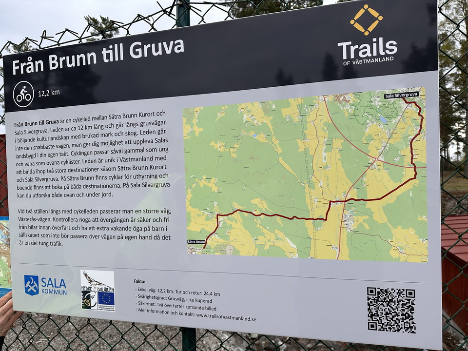 Because the trail is a 12 km long end-to-end route between Sätra Brunn and Sala Silvergruva, you’ll have to turn around and go back the other way to finish at whichever trailhead you started from, cycling a total of 24 km. Therefore, it’s probably best that anyone who only wants to bike the trail once, like those with small children, make transport arrangements to pick them up at the opposite trailhead of where they started.