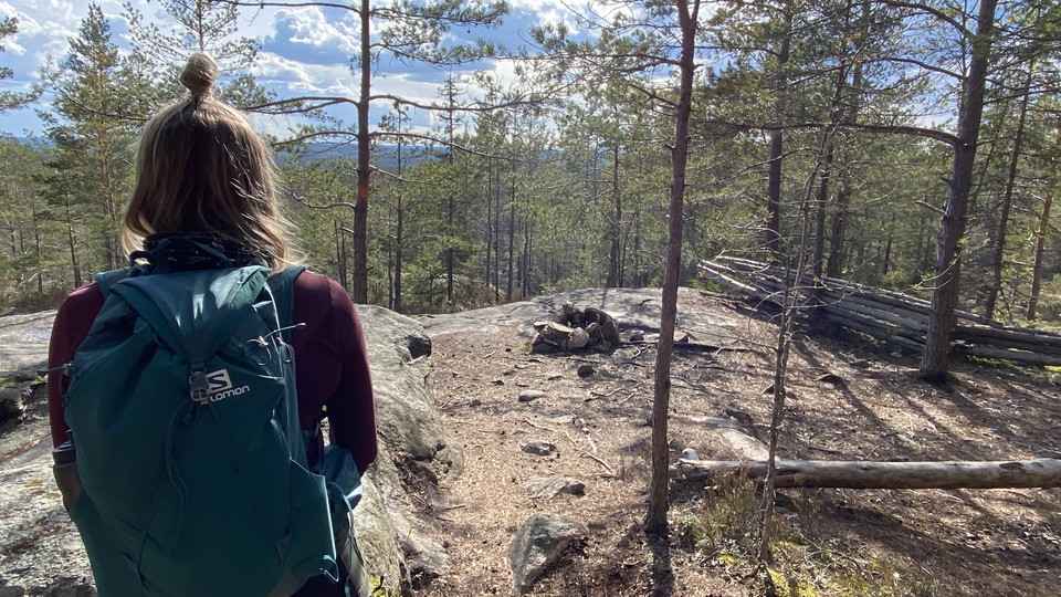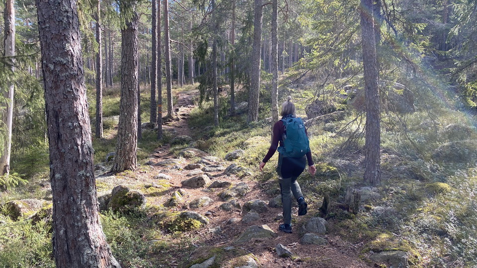 The Landsberget Triangle is a well-marked trail that’s very easy to follow. Trailheads with maps are located at the upper Landsberget parking area and the Trummelsberg parking area. The route mainly runs along natural forest paths with some rocks and roots throughout. The terrain is hilly in some stages, especially around Landsberget hill. Walkways and bridges allow hikers to safely cross over water and marshy ground. For overnight stays, there’s a wind shelter with a fire pit at the top of Landsberget hill and a small cabin with a firepit at Stora Trehörningen lake. There are also many spots to rest and take a break around the lakes and at various lookout points. The whole hike takes 5-6 hours, depending on the number of breaks.