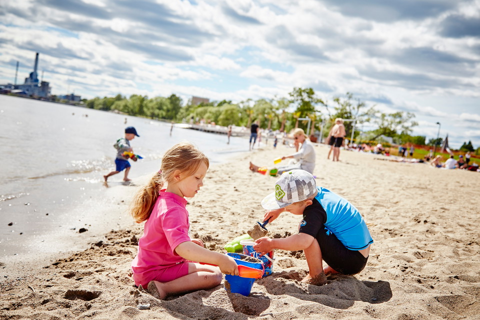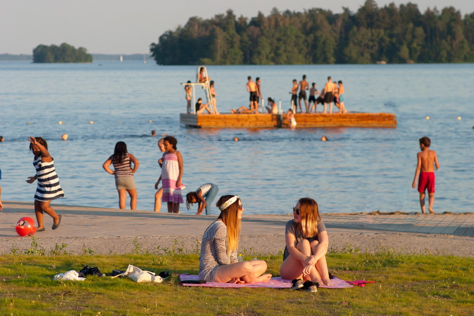 There is a large sandy beach and large jetties for sunbathing. During the bathing season there is a bathing raft with a diving tower, showers, kiosk and toilets. Next to it is a large grass field with beach volleyball courts. Nearby is also Lögarängsbadet, which is a municipal bathhouse that also has an outdoor pool.
