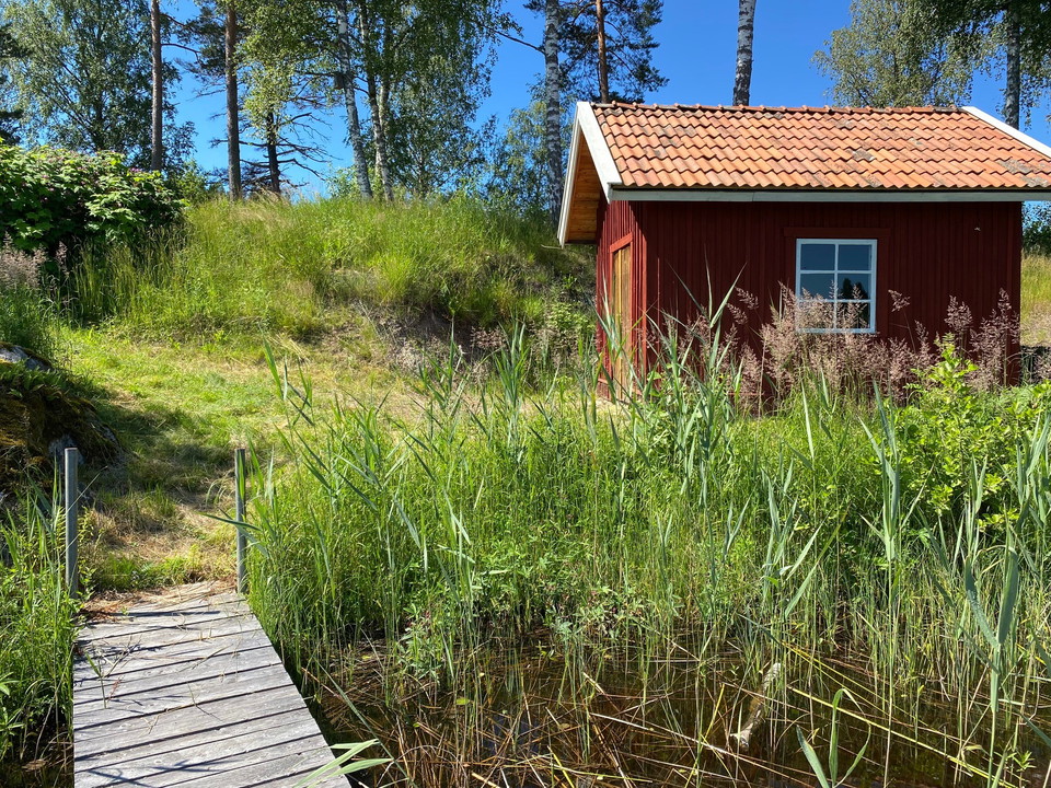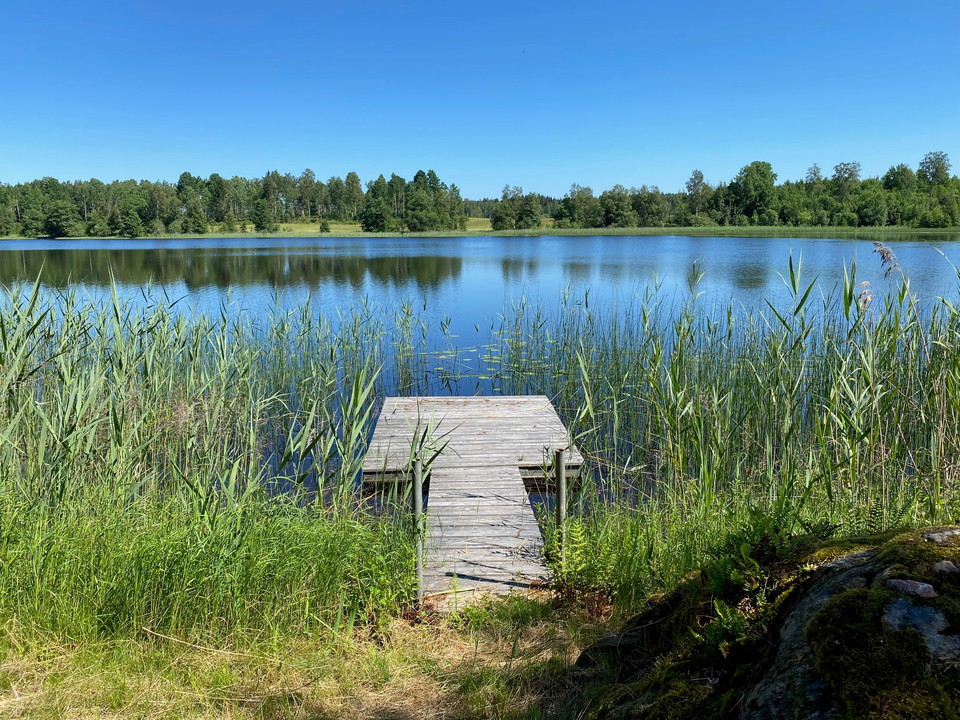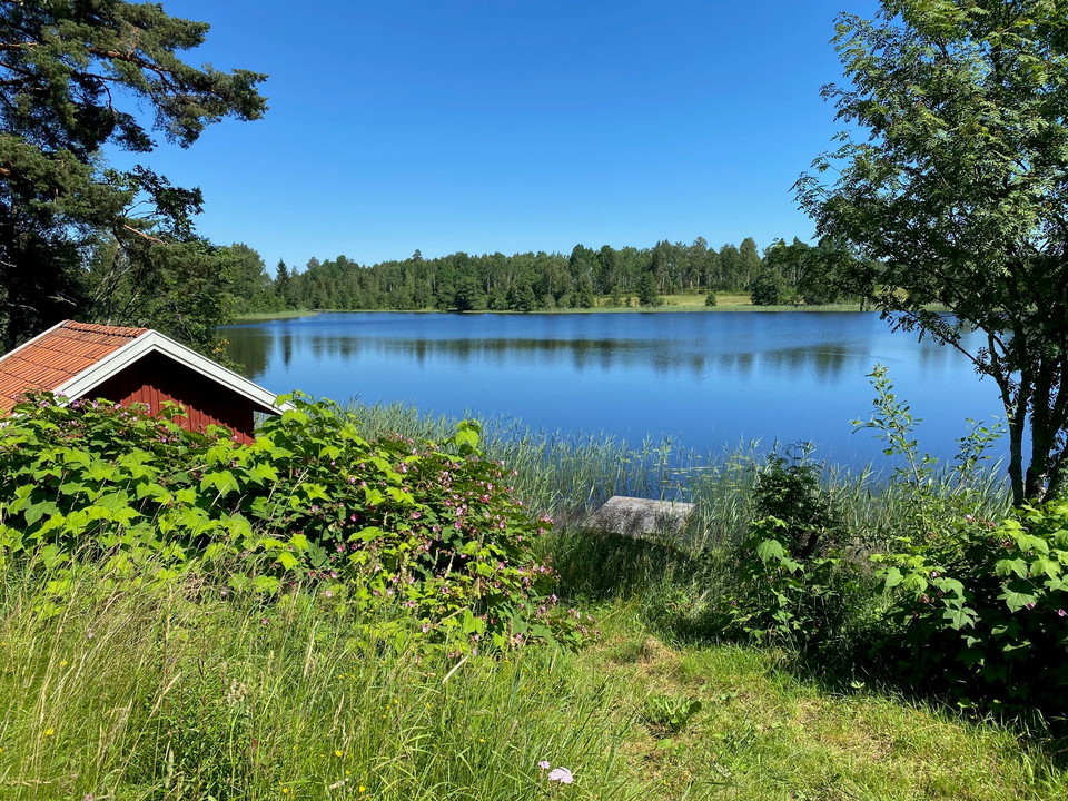 Along road 596, between Uttersberg and Karmansbo, you'll find Oxbron's railroad keeper's cottage on a headland above Lake Tomasbo.