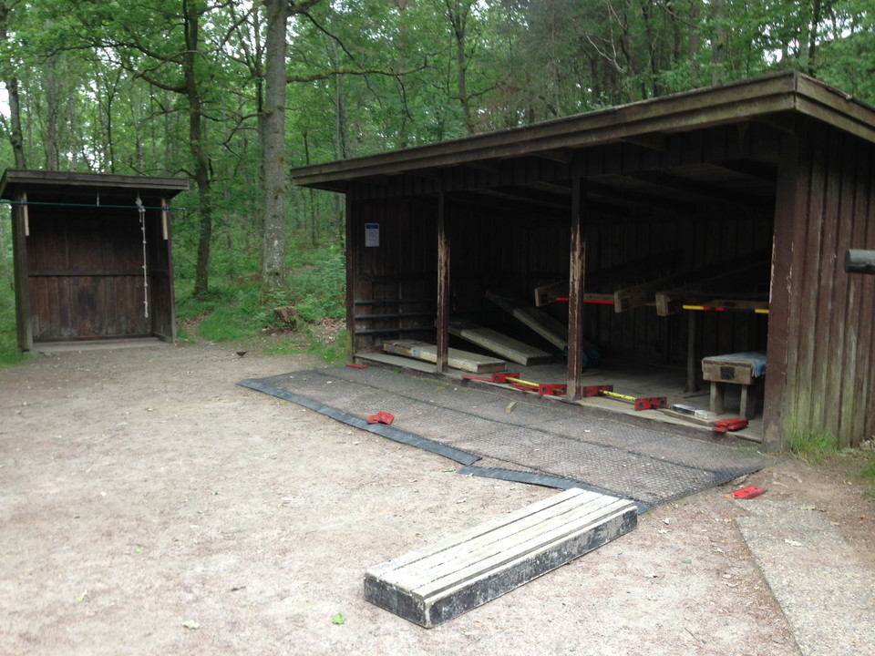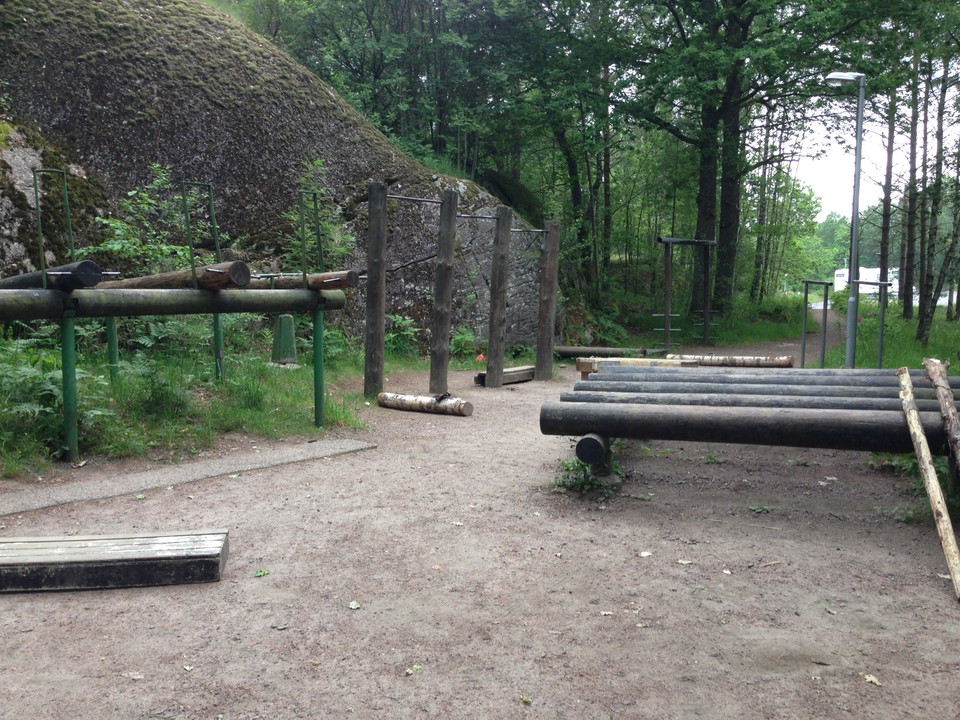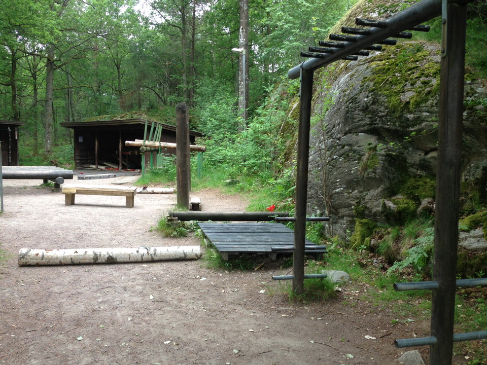 Relatively complete outdoor gym with everything from obstacle course, bench press, dumbbells to pull-up bar.
