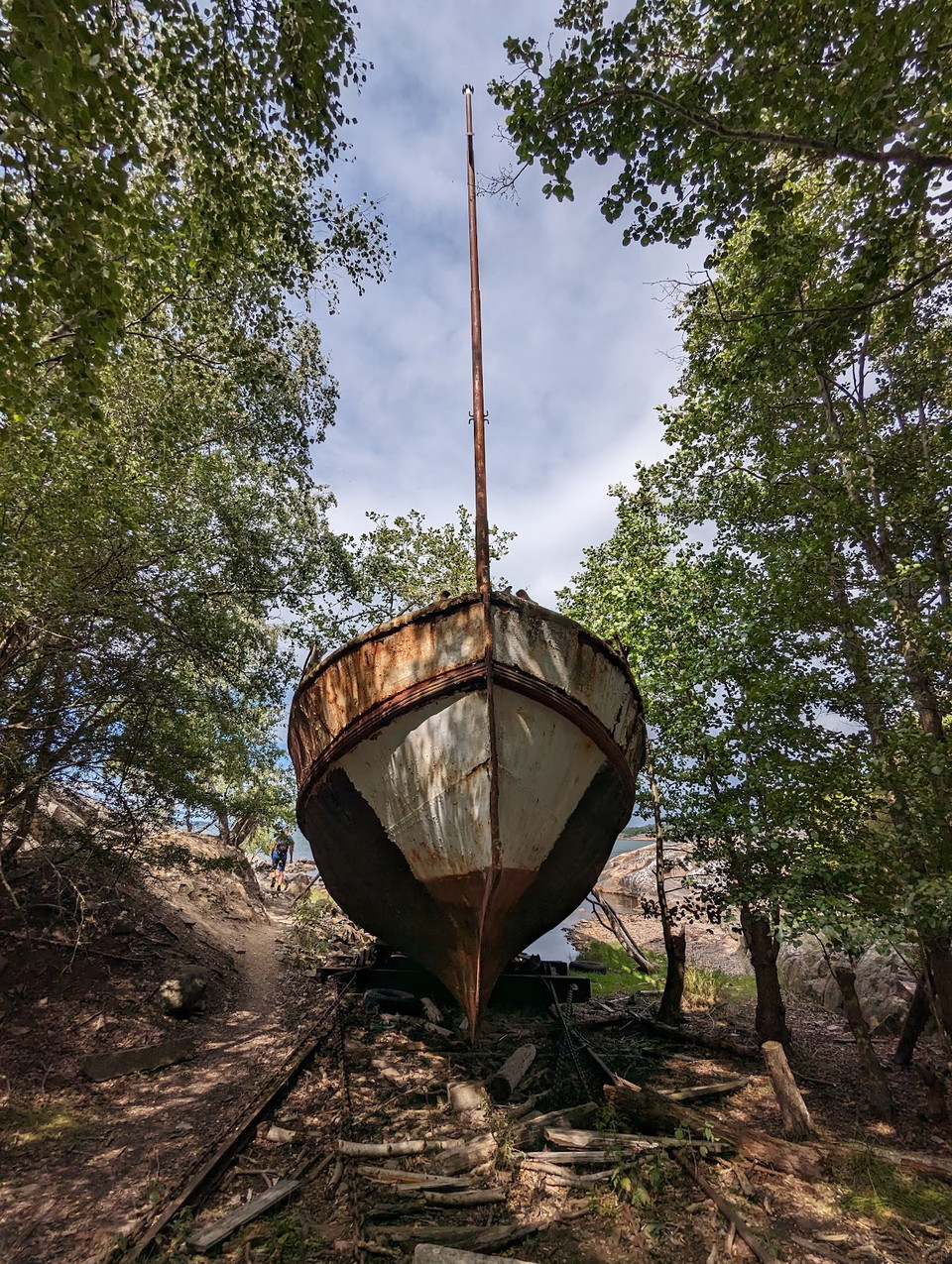 Pysäköinti on saatavilla Stenbräckan leirintäalueella. Seuraa reittiä pohjoiseen veneen hautausmaalle.