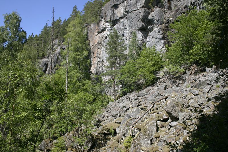 Tvärstupet is an approximately 50 meter high vertical fault with large boulder fields below. A fault is a surface along which a block of rock has moved relative to another block. The block is raised, lowered or moves laterally. The difference in height between the highest and lowest parts of the reserve is about 150 meters over a distance of about 500 meters.