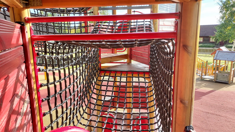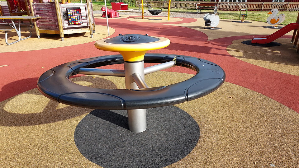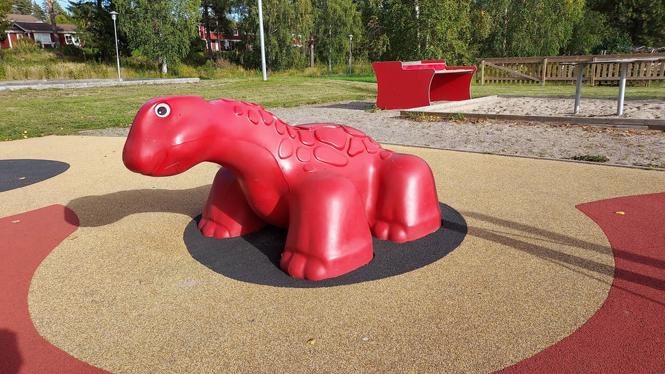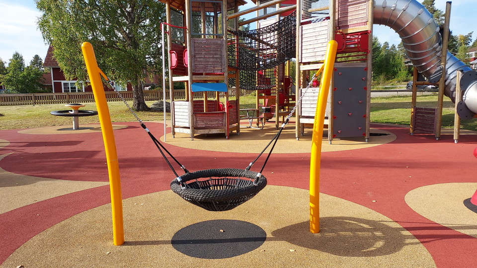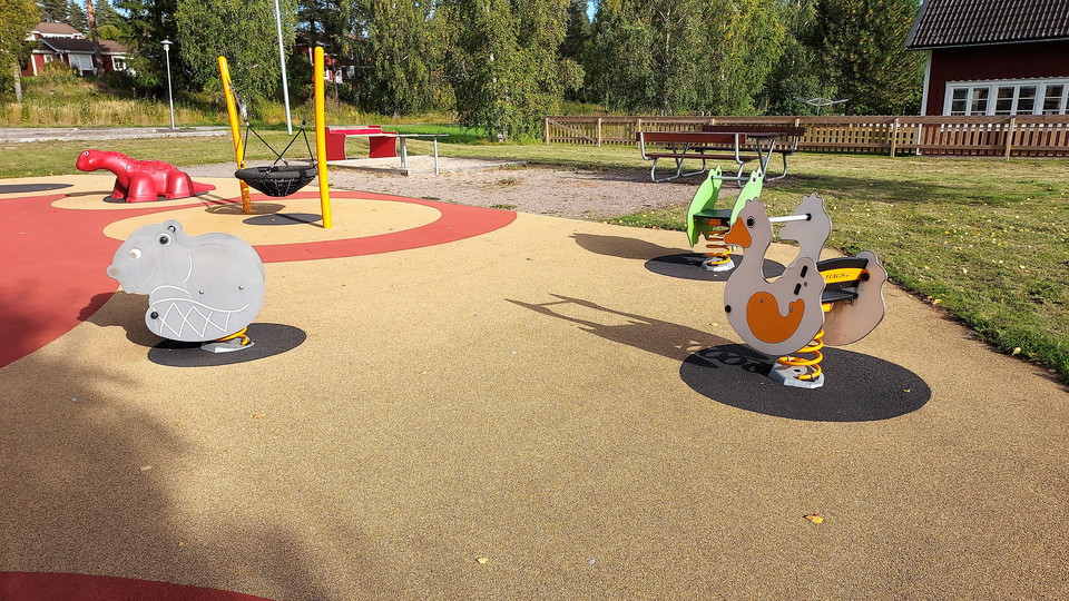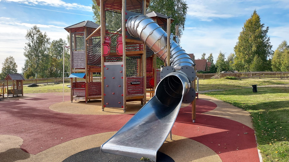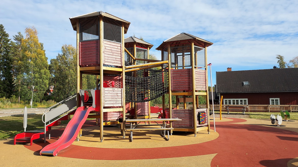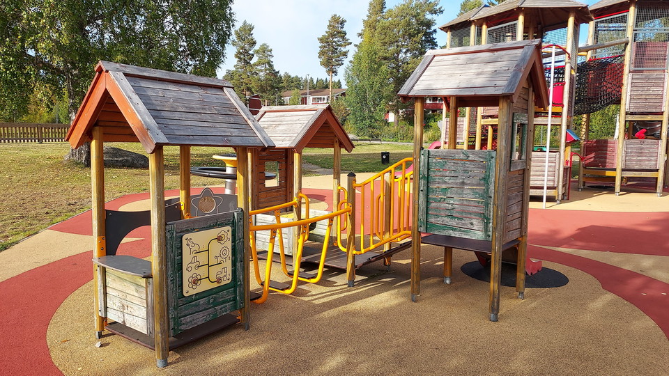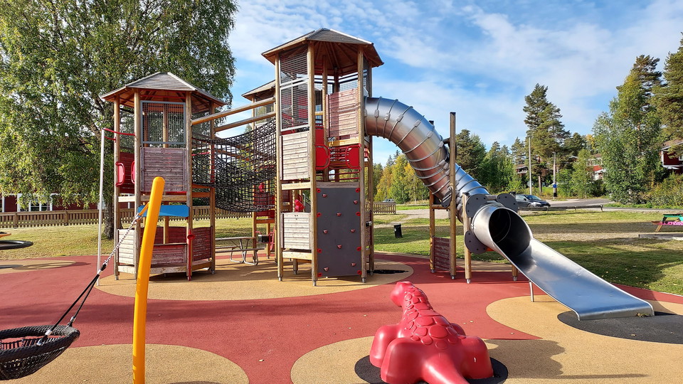 Mukava leikkikenttä, jossa on monia eri-ikäisiä leikkityökaluja.