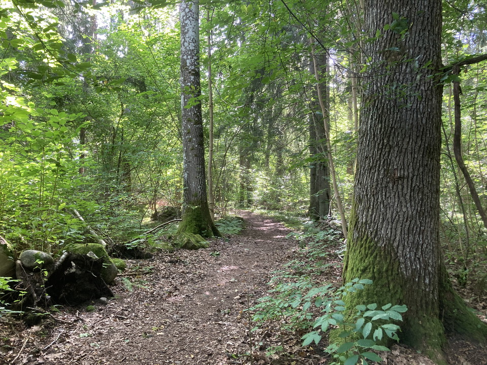 Parkkipaikalta Skölvboslättin urheilualueelle voit seurata metsän läpi kulkevaa polkua ja luonnonpuistoon.