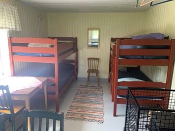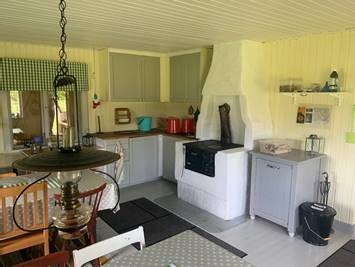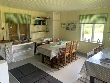 The cabin can also be booked for overnight stays. There are two bunk beds and a folding extra bed, five beds in total. Wood stove and fireplace for heating. For cooking there is also a gas stove. Water is available in a well in the yard. Mull toilet is adjacent to the cottage. Electricity is not available, lighting in the form of kerosene lamps.