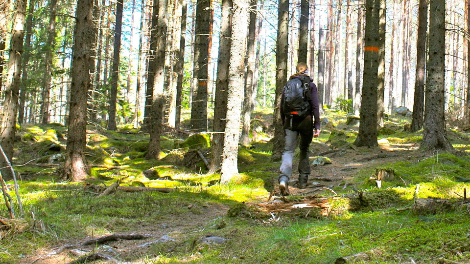Nyt seuraa hieno vaellus pitkin polkuja ja metsäteitä läpi erilaisia metsiä. Juuri ennen Hagbyn maatilaa tulet soratielle, joka päätyy niittyjen ja hattujen ohi.
