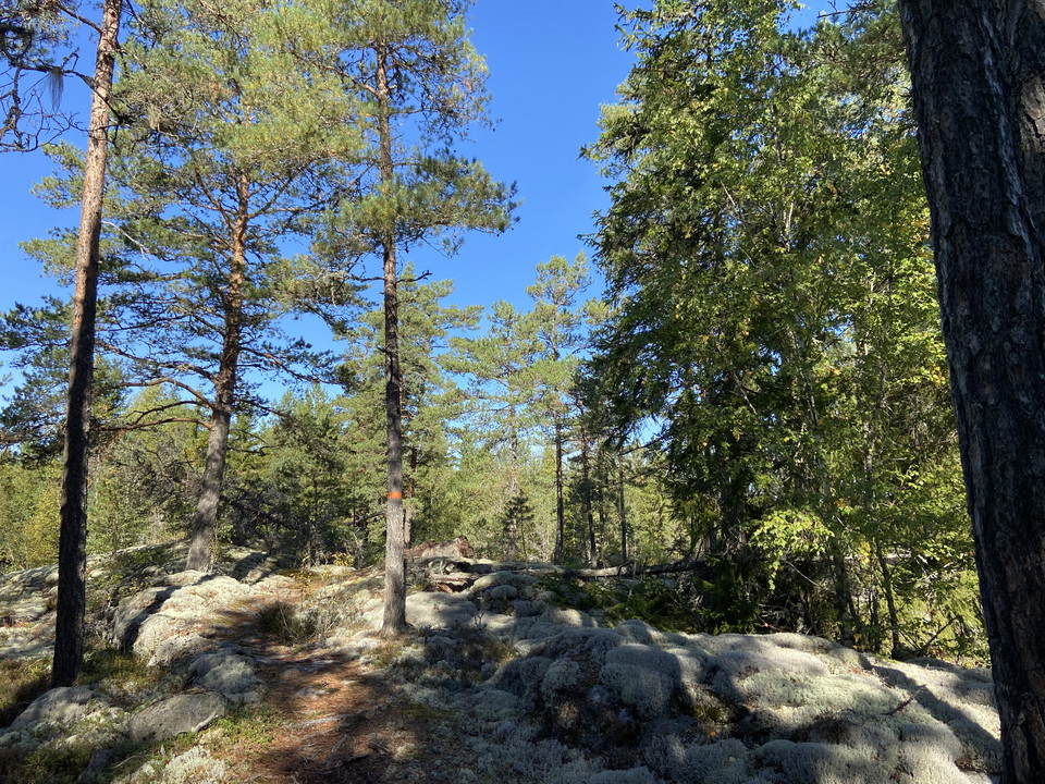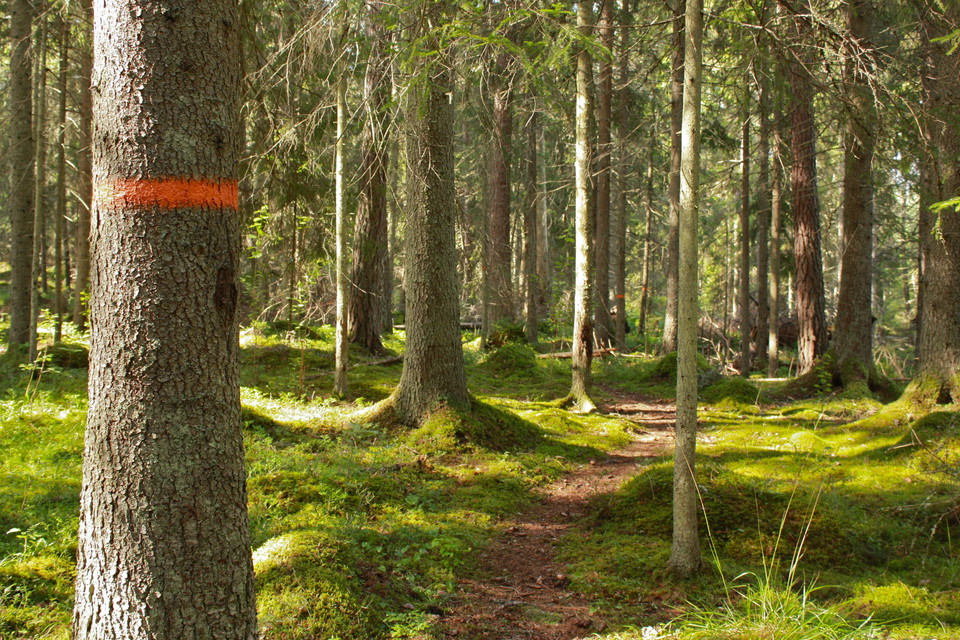 Jätät Södersjönin uimarannalle ja kävelet vähän soratietä ja niitylle päättyvää metsätietä pitkin. Jos merkinnät ovat vaikea nähdä, pidä oikea reuna, löydät pian polku uudelleen. Niityn päässä metsäpolut kulkevat. Seuraavat kilometrit kävelet hetken läpi tiheän graniummetsän ja seuraavaksi läpi ilmavampia mäntymetsiä mustikkariisi ja vuori kaataa.