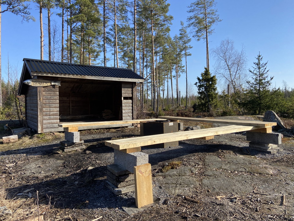 Vindskydd med eldstad och bänkar längs Upplandsledens slinga 11:1 (Dammledenslingan).