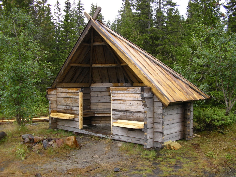 ved saknas, vedförrådet utan dörrar, vindskyddet har trasiga bänkar.