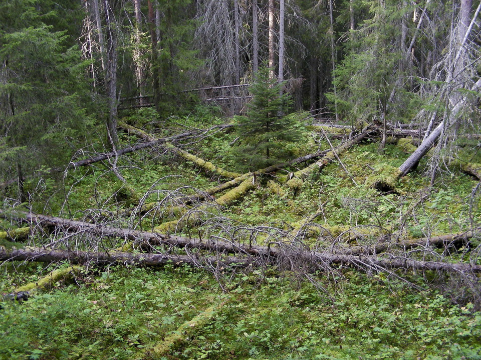 Vi stötte på något som såg ut som en gammal körväg i reservatet och på några få ställen såg det ut som att någon försökt rensa den på fallna träd med motorsåg.
