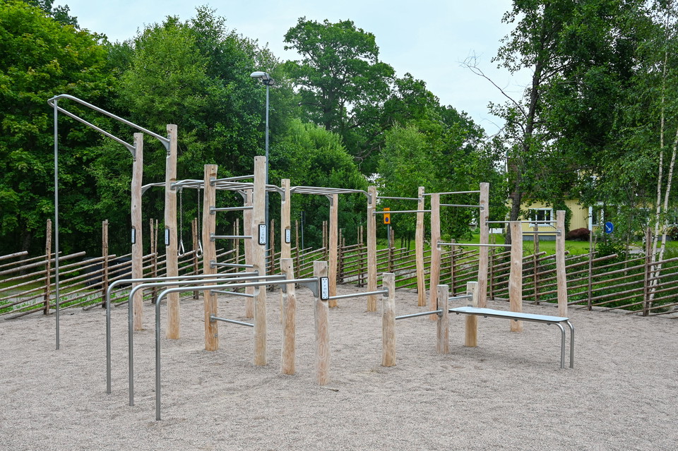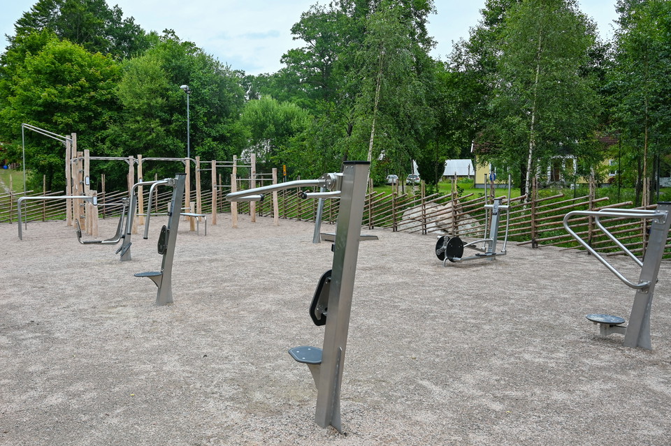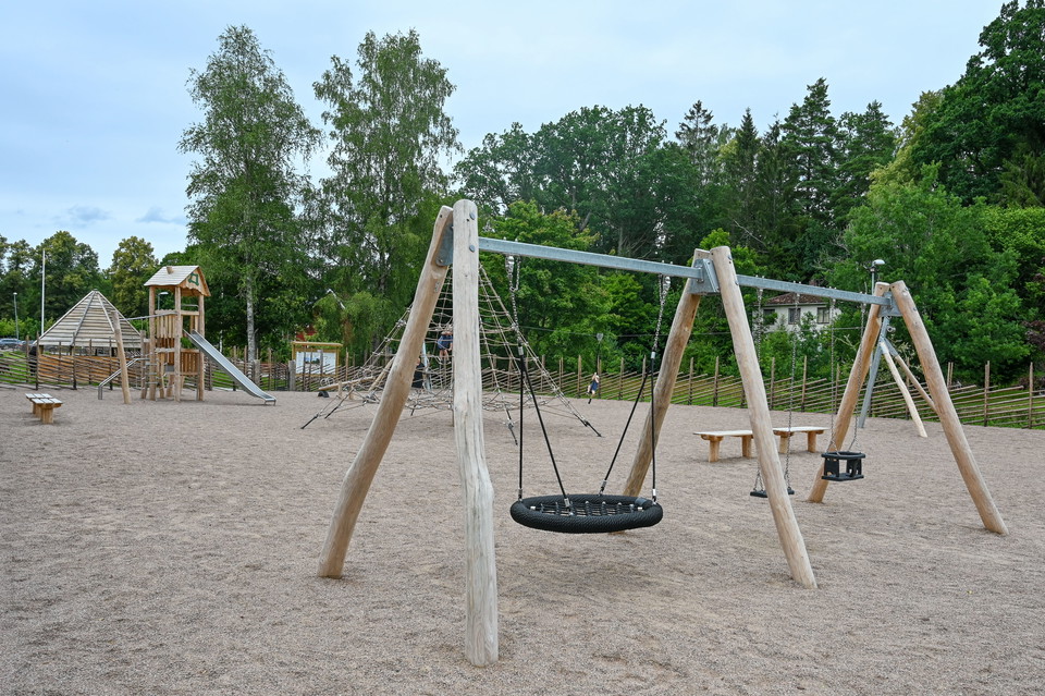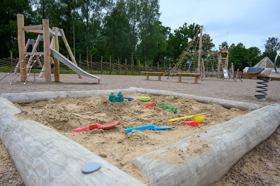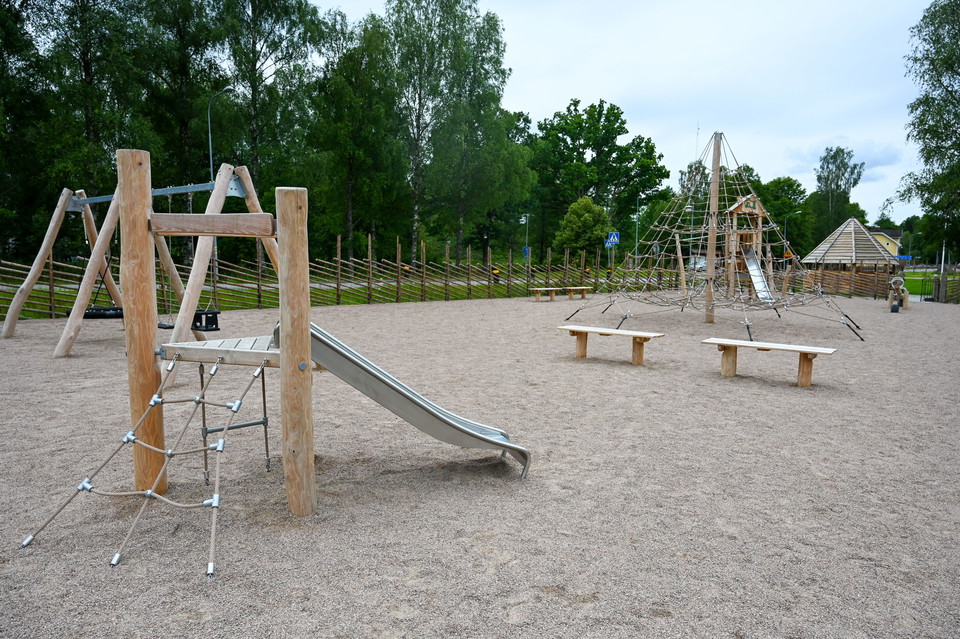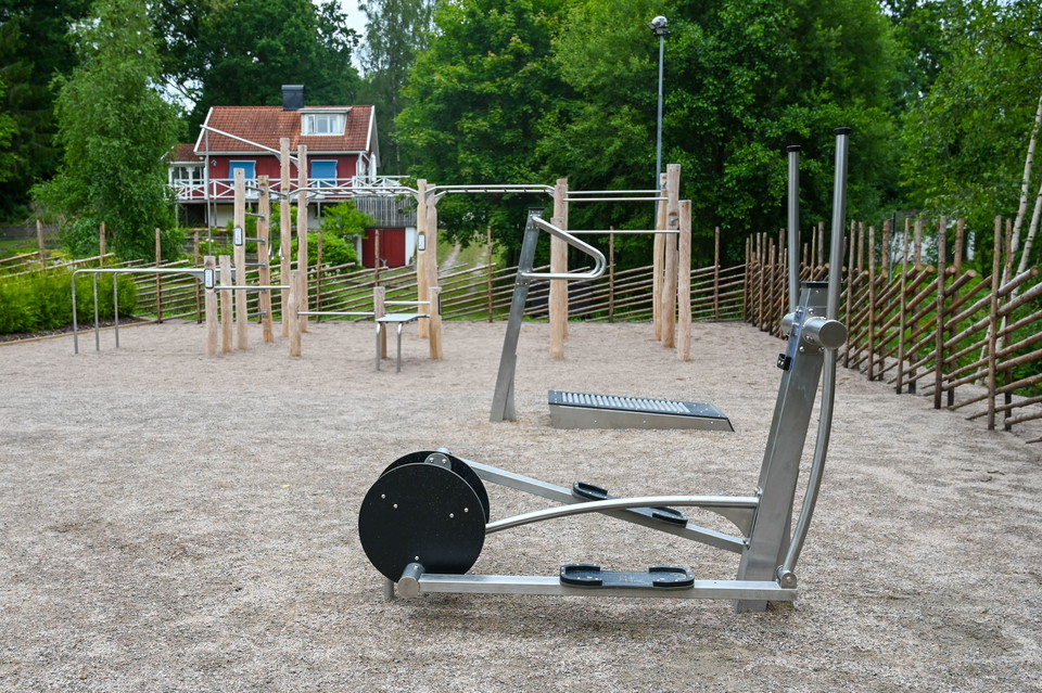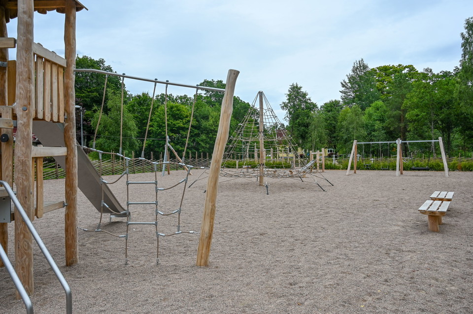 A playground suitable for all ages. It includes a zip line, jungle gym, slide, and sandbox. The area is called ‘Generation Hallaryd’ and also features an outdoor gym, boules court, and barbecue area.