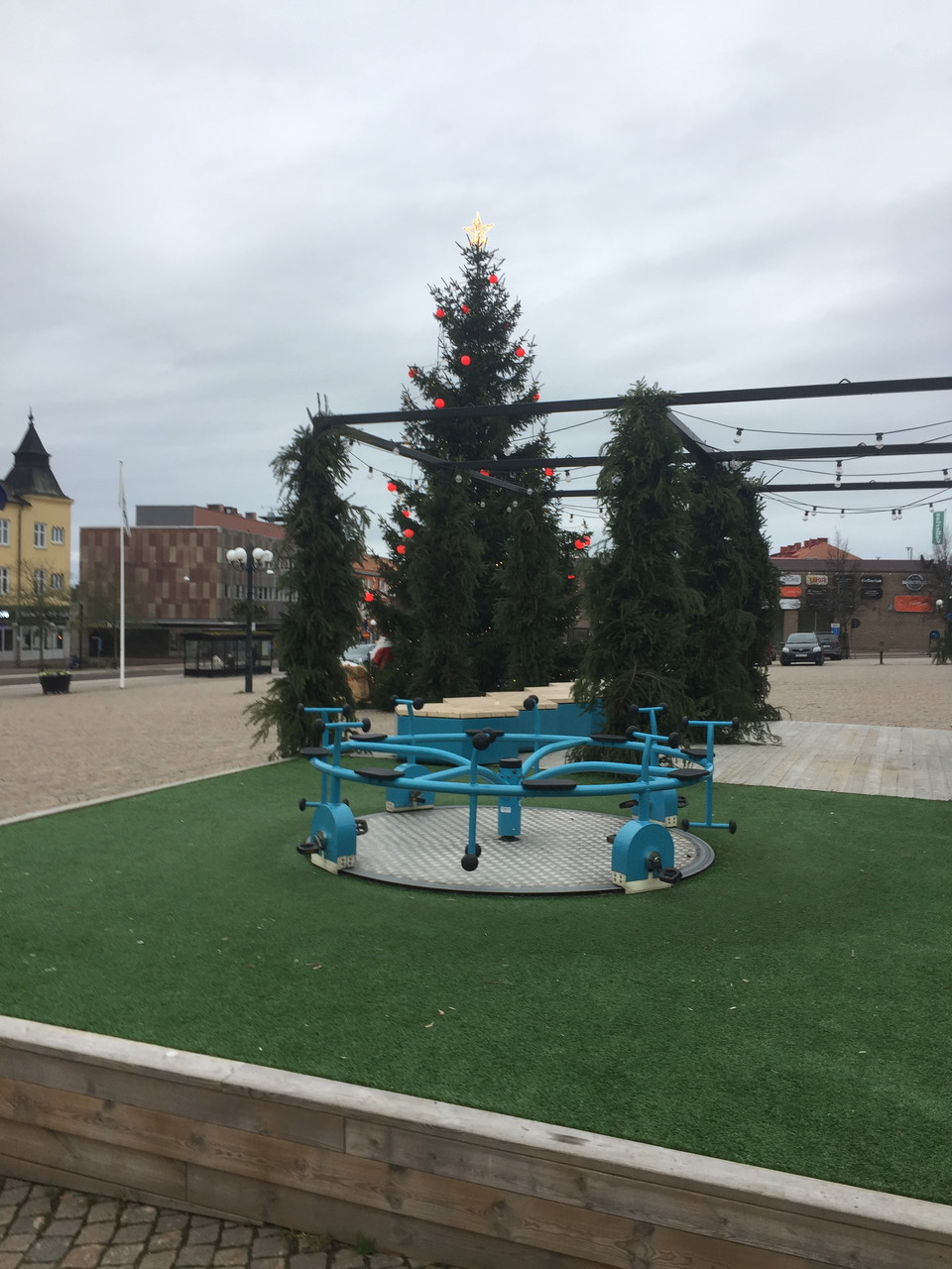 Välkomna alla barn att ta en runda i cykelkarusellen! På vintern står tomten och väntar vid granen.