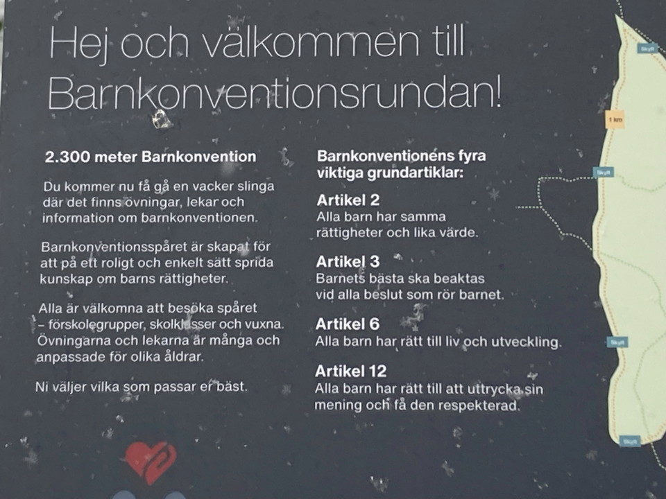 The Children's Convention Round is 2.3 km long and runs on cycle paths in Rydsskogen. Start and finish are at the service house. Along the Children's Convention Round, there are 7 stations with information about the most important articles. At each station there are practical elements in the form of various games linked to the subject.