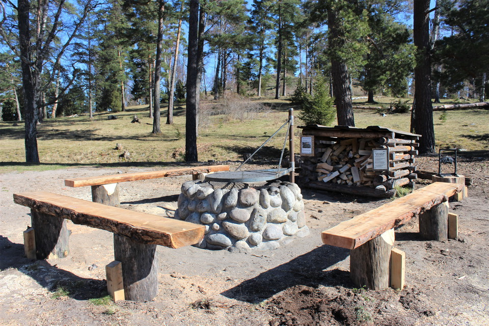 There is a walled fireplace with a grill grate, three benches made of logs and a woodshed where you can collect your firewood. There are also several picnic benches with tables nearby. At the eastern headland there is one with space for a wheelchair. The fire pit is located on the western shore of Brandalsund nature reserve.