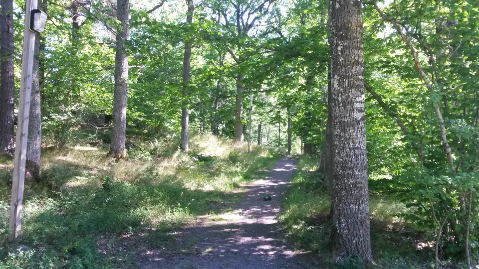 barnvagn vänligen, lett kuppert terräng, 2-3 brattere bakker. Vandring på grusväg längs hästhagar och lövträd. Ca 2,5 KM
