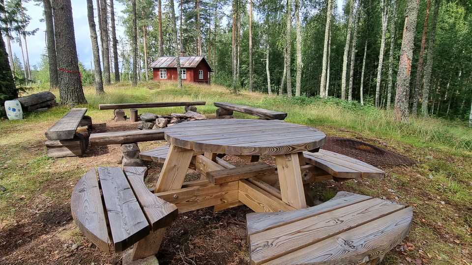 The cabin is open if you want to take break inside. Outside there are benches with a fire place and a bench table.