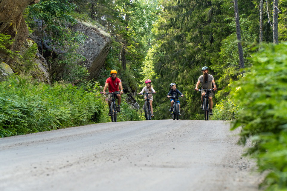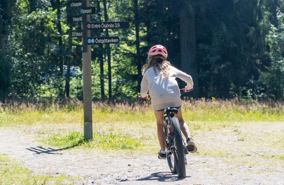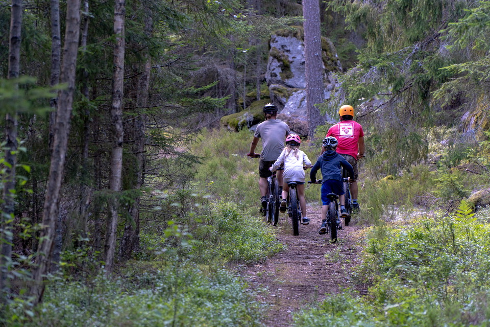 After the main entrance you continue on the road until you turn right onto an old forest road, just after the parking lot of Lake Metesjön. A nice easy ride, surrounded by troll forest and boulders.