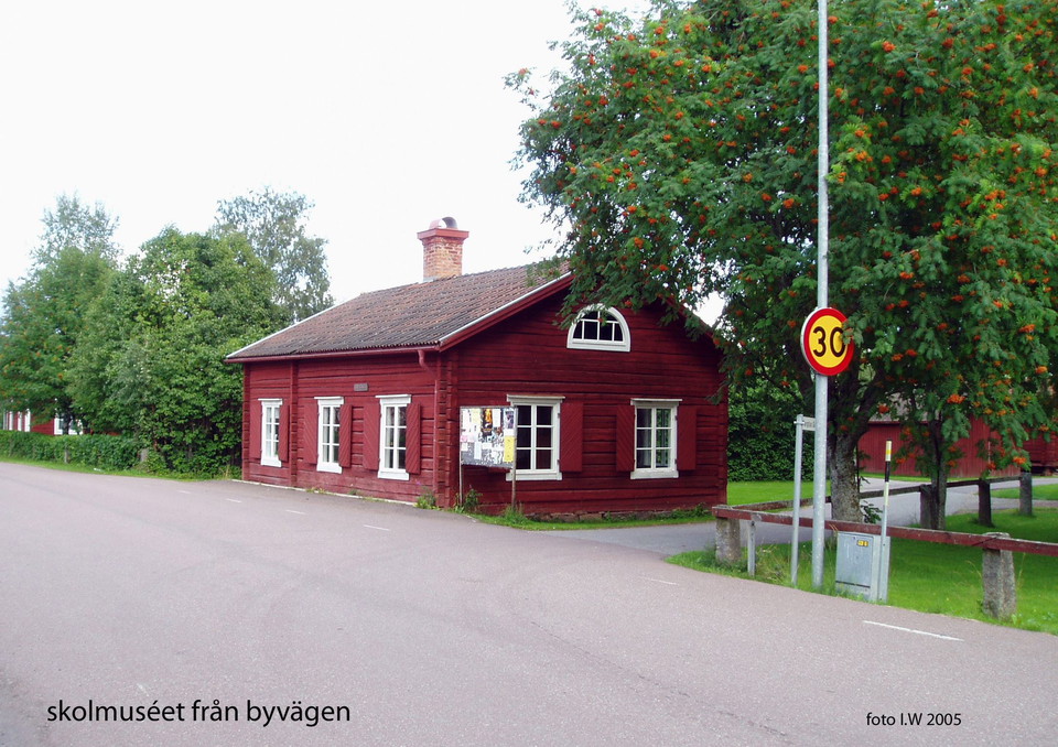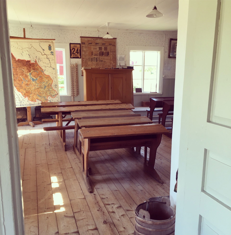 Skolan byggdes 1865 och var i funktion till 1942. Här upplever du den gamla skolan med gammaldags skolbänkar, griffeltavlor, hartassen som användes som sudd, bläckhorn och pekpinnen hotfullt placerad på katedern.
