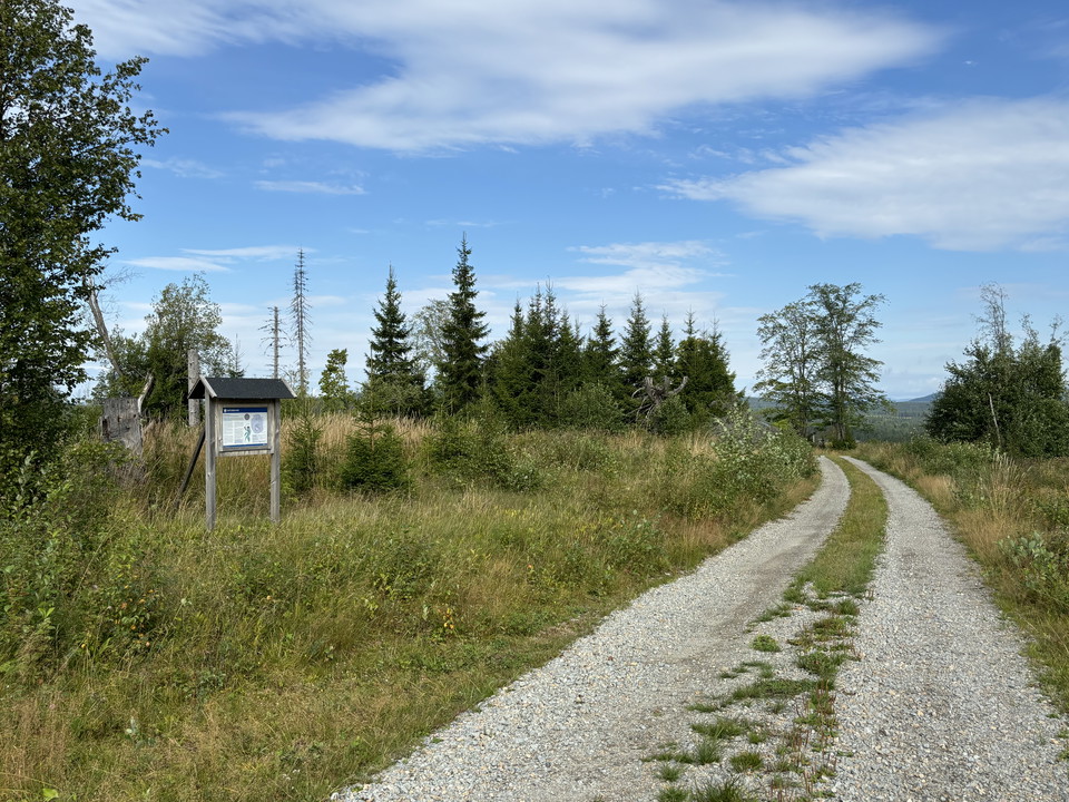 Open angst en bos landt met ongelijke oppervlakken. Langs de grindweg is het echter goed om ongehinderd te gaan.