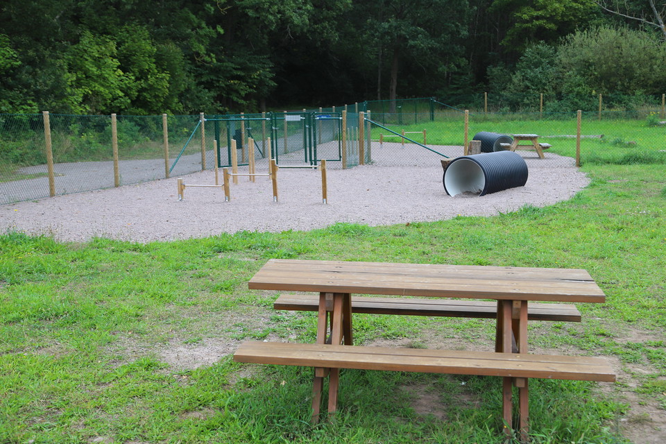 The fenced yard is divided into two parts - one for smaller and one for larger dogs.