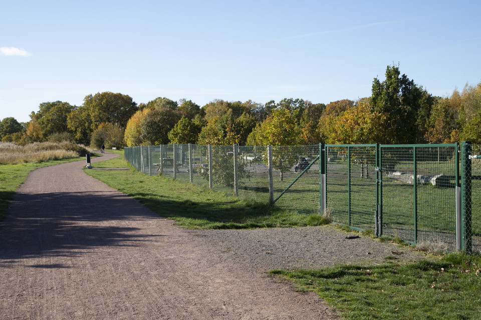 The dog park is located in Kalmarsundsparken along the gravel road that runs between the bathing areas.
