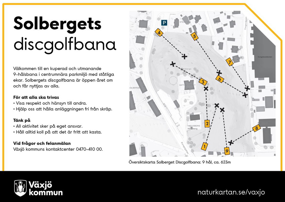 Een heuvelachtige en uitdagende 9-holes baan in het centrum van het park omgeving met verschillende statige eiken. Zoals voor alle parken, is het belangrijk om rekening te houden met anderen die in het gebied. De cursus kwam in de jaren negentig via het initiatief van de middelbare school naast en werd vaak gebruikt. Begin juni 2023 werd een betere banlayout met nieuwe thee en manden ingesteld door de DiscGolfPark Pro Target. Het resort heeft een flinke lift gekregen voor meer veilige kasten in het park. Dit wildpark heet zowel Hovsbergsparken als Solberget. Welkom hier voor een leuke ronde van activiteit!