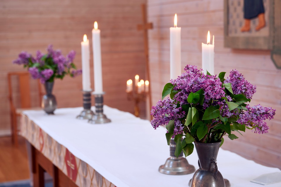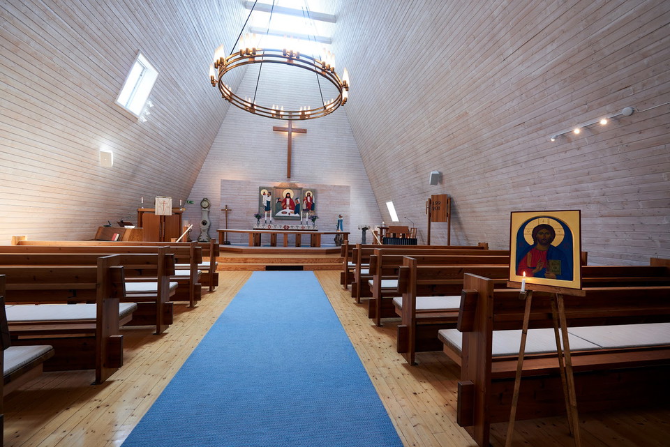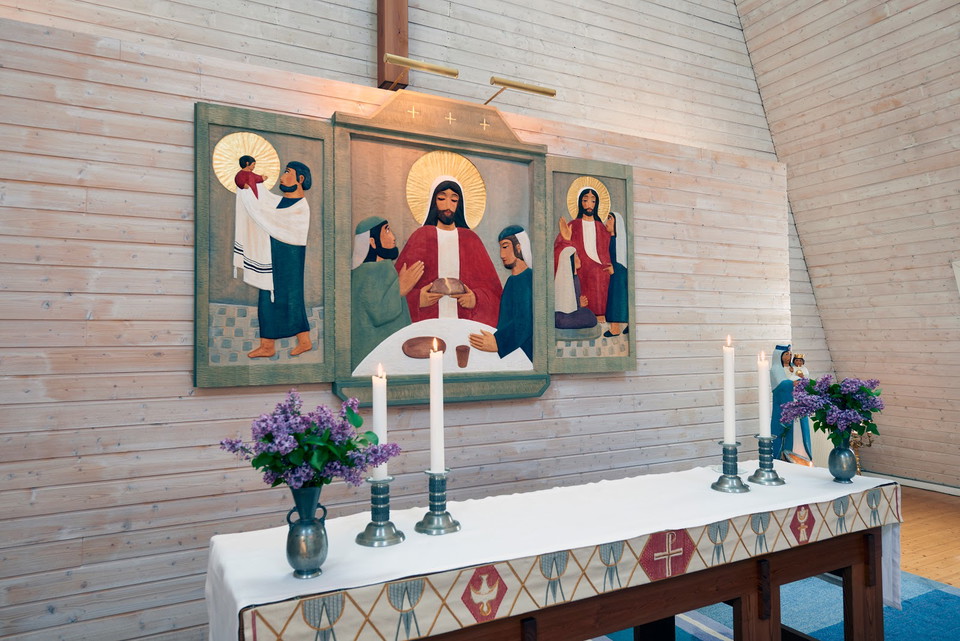 Het altaarkastje in het graan wordt in 1993 gekerfd door de gerenommeerde kunstenaar Eva Spångberg en vertegenwoordigt, in het midden, hoe de Opgestaane zichzelf een aankondiging geeft aan twee discipelen in Emmaus: Toen hij het brood brak, herkenden ze hem. De linkerdeur portretteert de oude Symeon met het kind van Jezus in de tempel, en op de rechterdeur zijn Jezus en Martha en Maria afgebeeld.