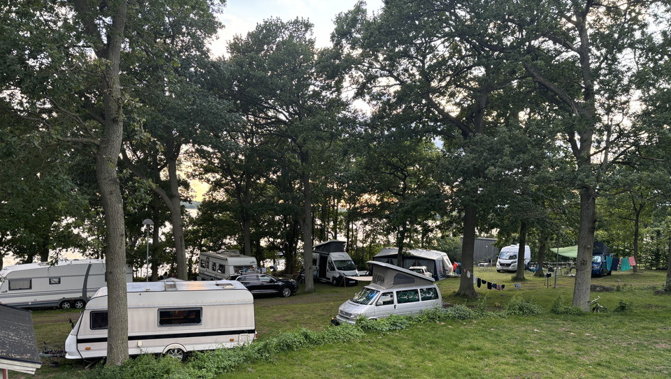 There is a well-equipped camping kitchen in the service building, which also includes toilets, showers, and a washing machine.