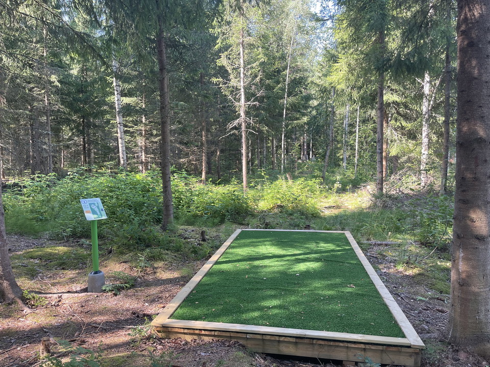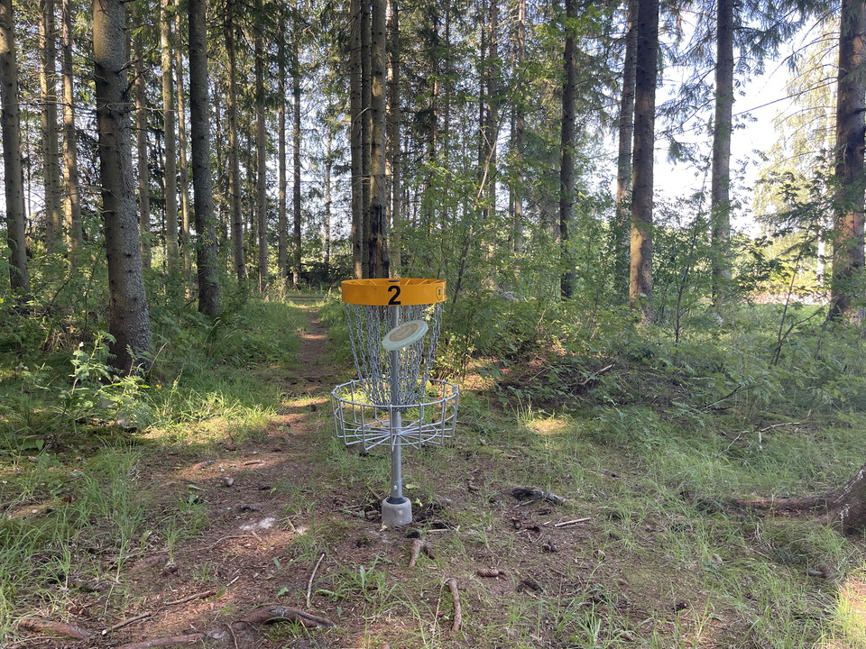 The disc golf park has twelve baskets and extends in a scenic area adjacent to Bärkevallen with football field and outdoor gym.