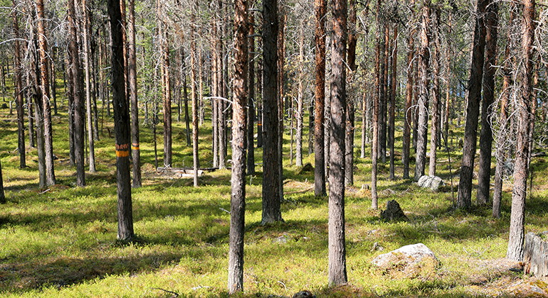 Skarjevare is one of the larger remaining areas in Arvidsjaur where we find old-growth pine forest on dry moorland. The area has never been clear cut, but in the past certain large trees were felled by hand, and stumps from that time remain there. There are also many other cultural and ancient remains in the area. One of the rarer species here is the long-horned beetle nothorhina muricata, which thrives on old-growth pines in sunny locations. The area is 4.2 square kilometres. Note that snowmobiling is only permitted on snowmobile trails.