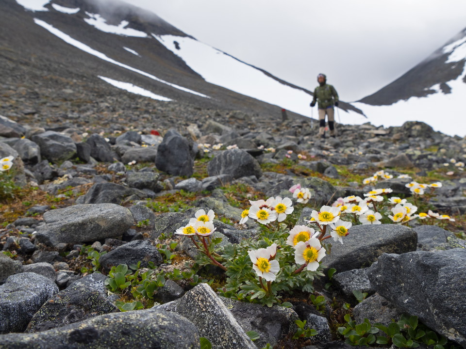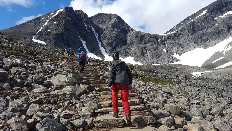 Stąd ścieżka prowadzi w kierunku Vierranvárri 1700 m.ö.h. Teren przechodzi teraz do wysokoalpejskich blokad i pól śniegowych. Podążaj za zaznaczonym stawem w górę i w dół. Kamienne schody zbudowane z szerpów z Nepalu znajdują się wzdłuż części wspinaczki.
