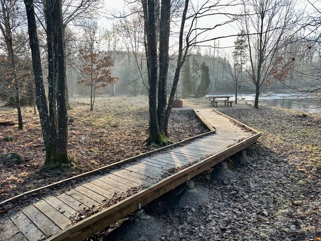 Grusad stig och spång om cirka 50 m fram till grill- och rastplats. Tillgänglighetsanpassad.