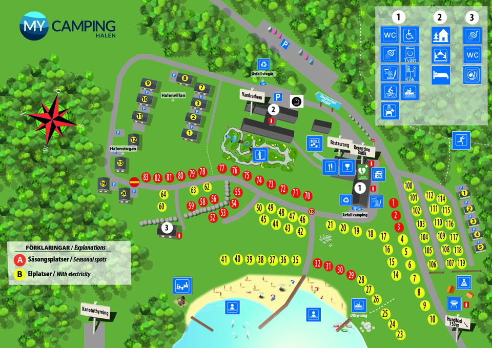 På Halens Camping hittar du många faciliteter. Oavsett om du tältar eller behöver en husvagnsplats så kommer du att bli en nöjd gäst. Här finns ca 120 campingplatser med el. Alla platser är gräsbelagda. Elbilsladdning erbjuds för allmänheten.