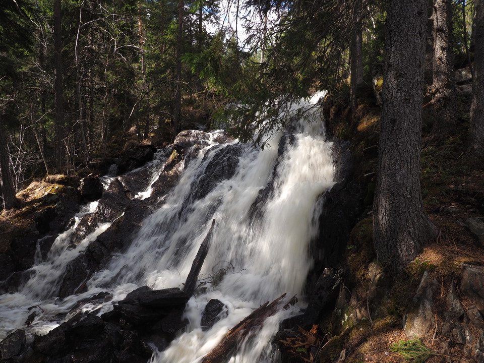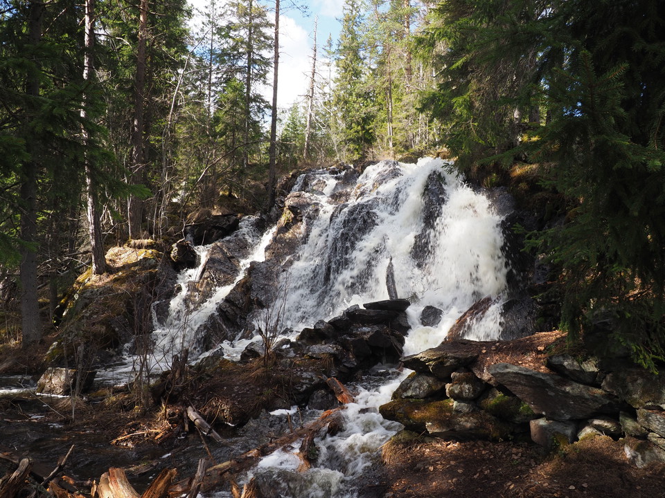 Troligen de mest spektakulära vattenfallen i kommunen. Leden tar dig runt en slinga där det är möjligt att se vattenfallen från bägge sidor. Flödet i bäcken och fallen varierar kraftigt och mest spektakulärt är det under vårflod eller just efter ett kraftigt regnväder.