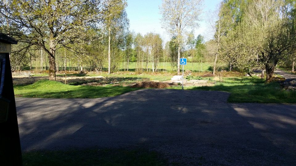 Stor grusparkering och en handikapparkering framför ladan.