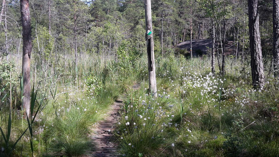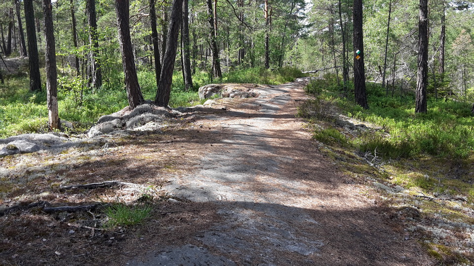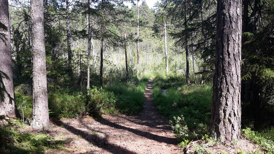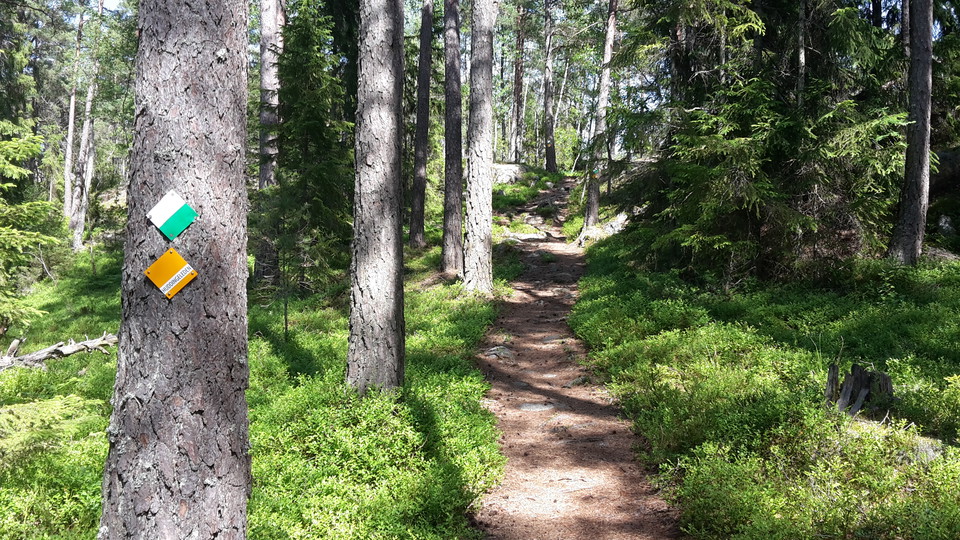 Motionsspåret Skogsmilen går både på gångvägar och på opreparerade stigar i skogen. Spåret är markerat med grönvita markeringar.